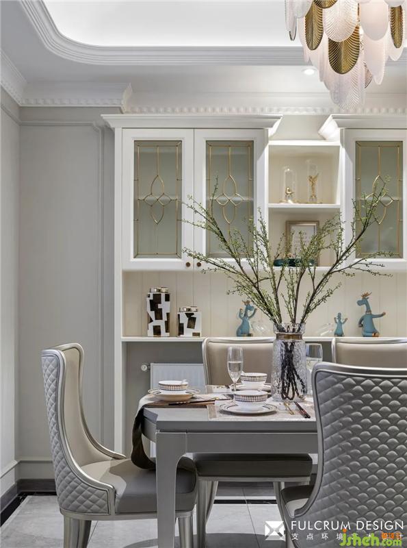 按照現(xiàn)場(chǎng)暖氣設(shè)備的尺寸、位置,設(shè)計(jì)餐邊柜的分隔形式,把設(shè)備完美隱藏。