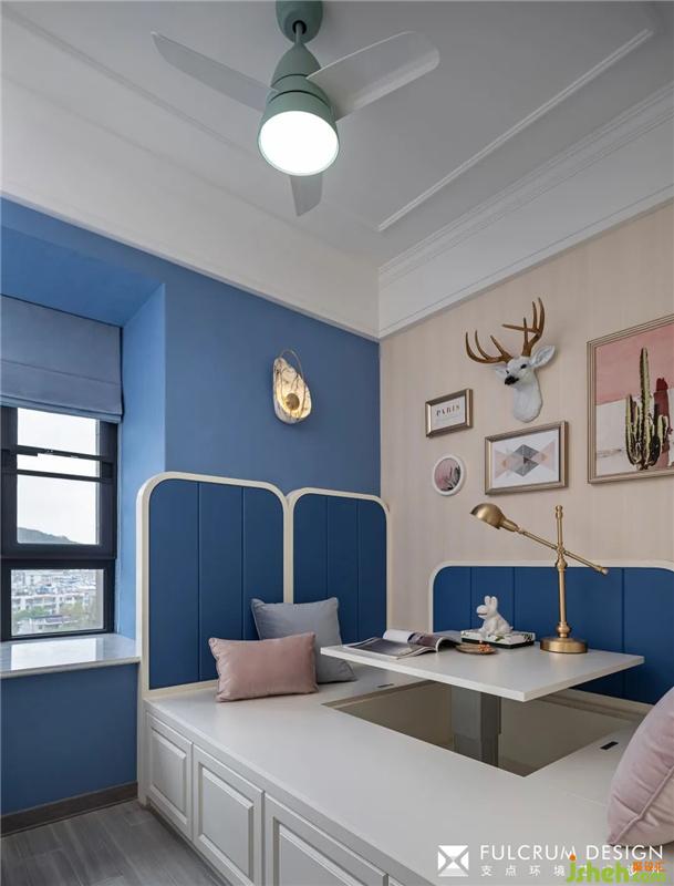 從靠背到架子都是粉色的床品,是男主人想滿足女主人的少女心,投其所好送的禮物,設(shè)計(jì)師綜合男性審美和日后生活考慮,選用了耐看的裸粉色。