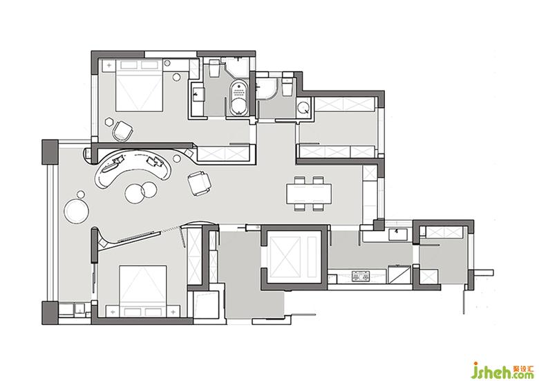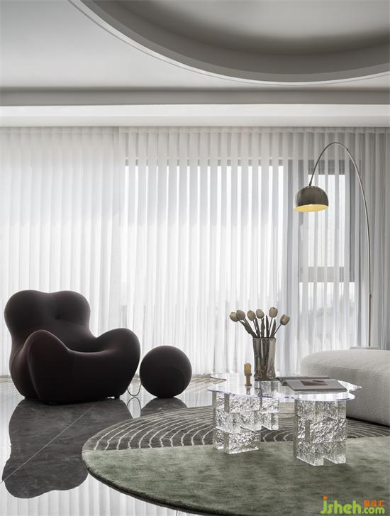 沙發(fā)旋轉(zhuǎn)30°,居者在家中可直面江景,「喇叭形」的客廳布局順勢而生,延展客廳視距的同時(shí)仍保留了南向次臥室的衣柜長度。