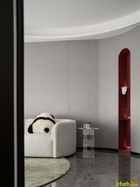 喇叭形客廳、DIY茶幾、好多弧形,"不規(guī)則"是這個(gè)家的初印象;純粹的灰調(diào)空間里,有亮麗的紅色、清爽的綠色,"色彩頑童"是這個(gè)家活潑的本性;亞克力、玻璃磚、不銹鋼、藝術(shù)漆、布藝硬包……家裝設(shè)計(jì)"材料學(xué)者"是這個(gè)家的本質(zhì)。