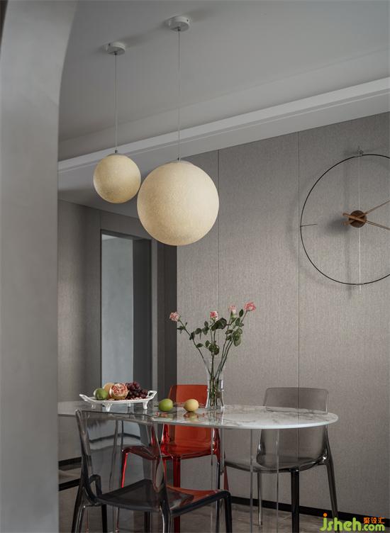 月球燈錯(cuò)落有致,簡約的掛鐘增強(qiáng)空間的線條感,花朵與瓜果,明艷與清香,家裝設(shè)計(jì)恰到好處的驚艷,真切的浪漫。