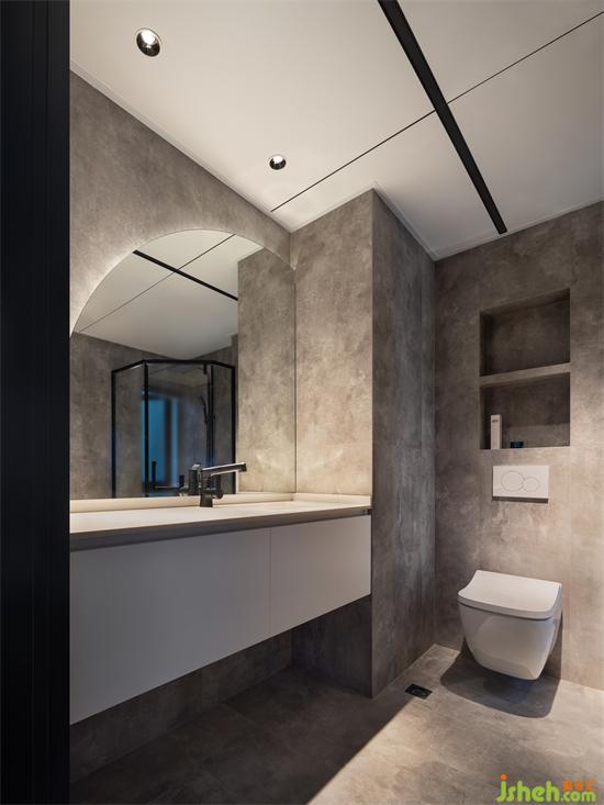 麻雀雖小,五臟俱全,在洗漱區(qū)對(duì)面有淋浴間和浴缸,儲(chǔ)物空間見縫插針,也算豐富,懸浮馬桶和面盆柜杜絕衛(wèi)生死角,減輕業(yè)主的清潔負(fù)擔(dān)。