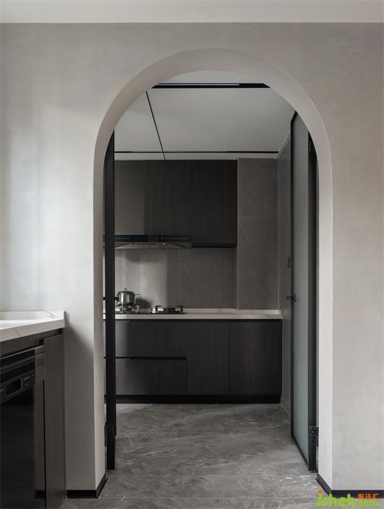 弧形、拱形出現(xiàn)在這個(gè)家的很多地方,旨在讓鋼筋混凝土盒子在視覺上更柔和,雙開門被安裝在廚房里,從而使這一側(cè)的墻面更簡練。
