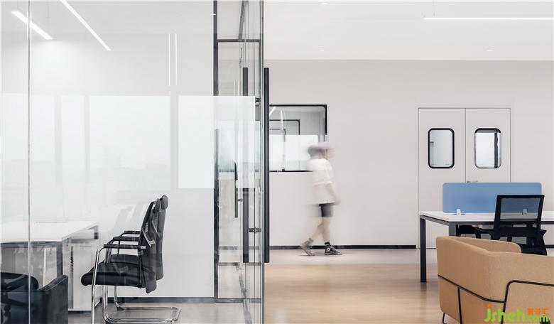 白色是整個(gè)重新建構(gòu)的空間中保持穩(wěn)定的部分,而由定制木質(zhì)造型的體塊、超白玻璃、家私形成的不同色調(diào),不同質(zhì)感的材質(zhì),就成了整個(gè)空間中最活潑的元素,與白色相得益彰。讓整個(gè)空間呈現(xiàn)出靜謐但不沉悶的氛圍。辦公室設(shè)計(jì)