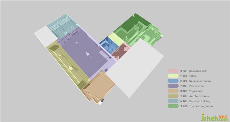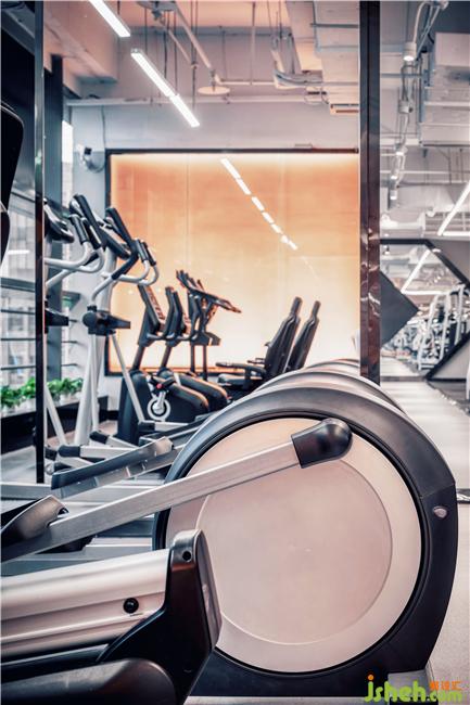 素白色的裸頂,不會使人壓抑。頂面燈光采用“俗氣”的日光燈管,目的是不會使躺著的健身者感受刺眼的燈光。大面積的銀鏡和燈箱,拓展空間,“儉樸質(zhì)約”。空間中一面橙色的玻璃,使空間多了一絲特點(diǎn)與韻味。健身房設(shè)計(jì)