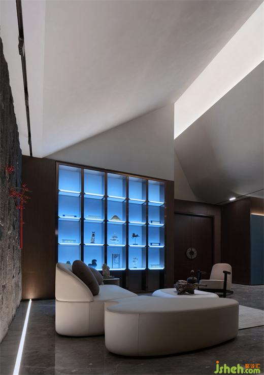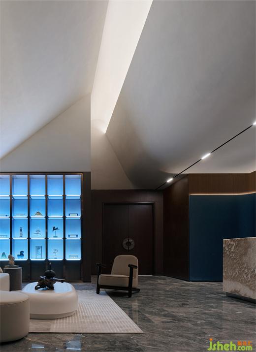 酒店設(shè)計(jì)空間里用解構(gòu)思維來表達(dá)舒張,將曲線和塊面凸出或交織,通過色彩和燈光關(guān)系的引導(dǎo),使得空間與材質(zhì)的過渡變得有序且自然。平入仄出的隱喻細(xì)節(jié),柔化了空間的界限,點(diǎn)線面結(jié)合燈光的組成構(gòu)建,打造視覺亮點(diǎn)又兼顧整體畫面。