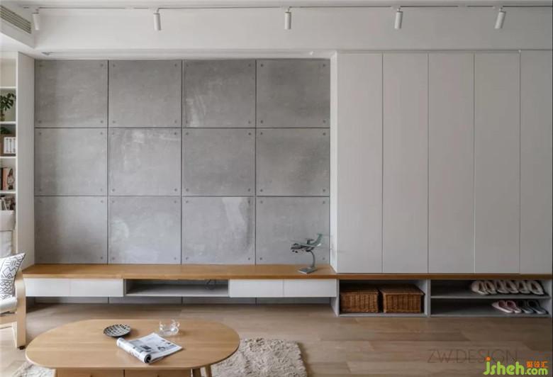 因為入戶門是緊挨著墻體的,所以我們將鞋柜退后了一些,放了一個實木換鞋凳作為緩沖。