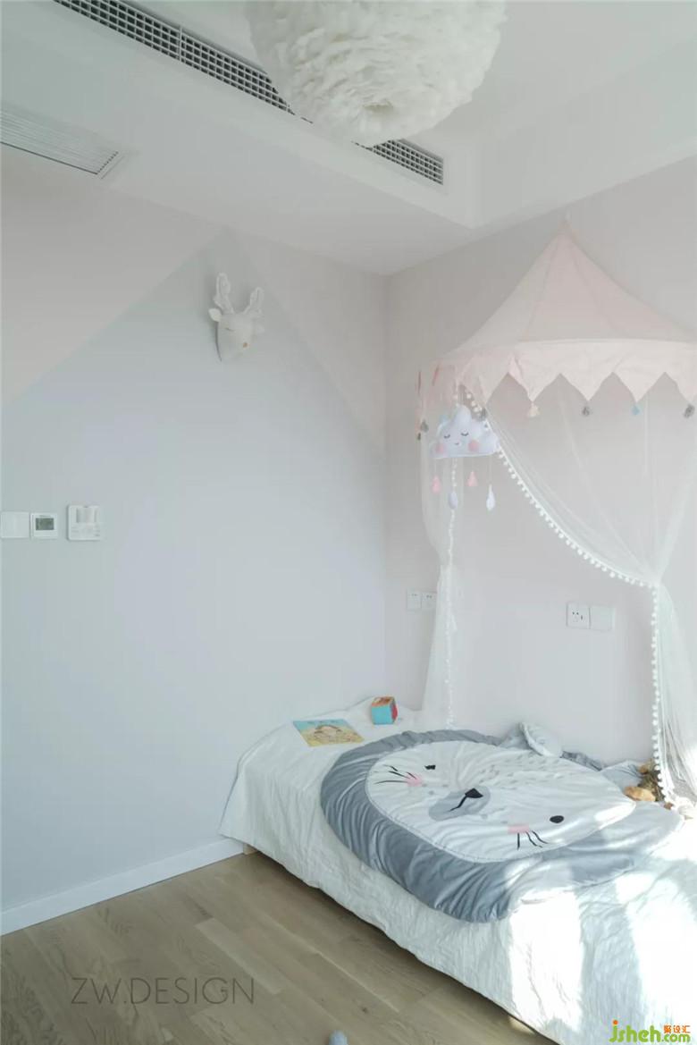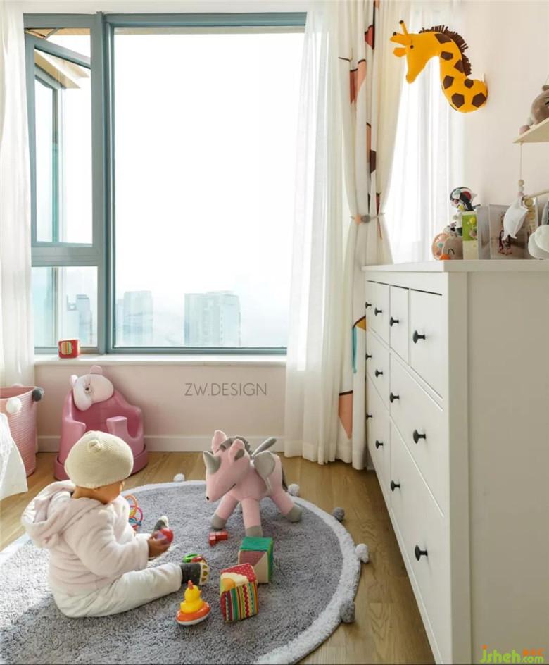 于是兒童房里設(shè)計為折疊床,白天折疊起來是寬60公分的小軟塌,且騰出了更多的空間作為寶寶玩耍的開闊區(qū)域。裝修公司