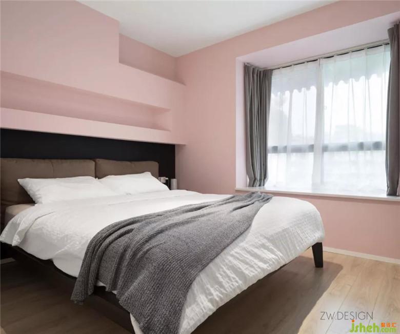 臥室采用了屋主喜歡的臟粉色和黑色的搭配,床頭造型的靈感來自于建筑大師柯布西耶的作品朗香教堂,右上角的空間向下切了45度斜角,是留給掛機空調(diào)的,下面的長條可以擺放一些書籍或展示品。