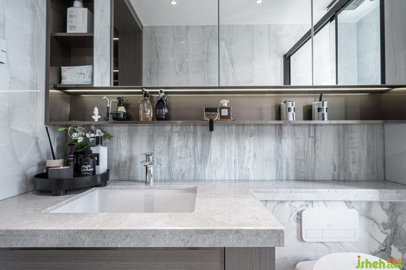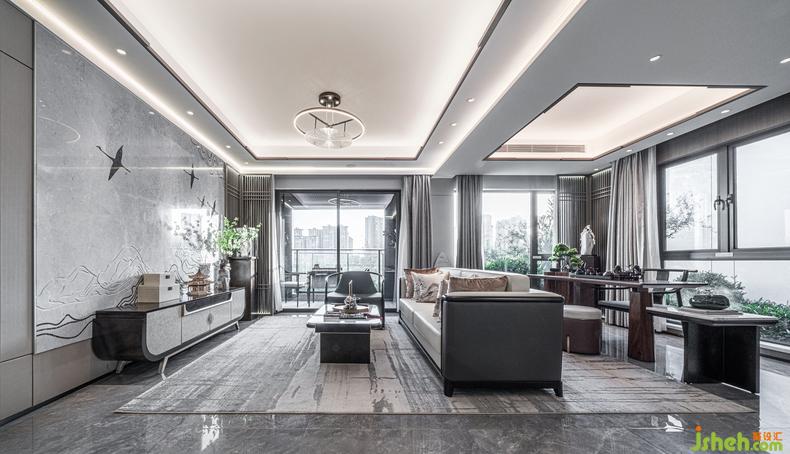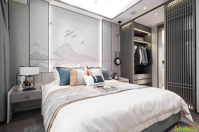 樣板房設計長輩房灰調性巨幅春意山水背景,還原心境最初的底色。儒雅的搭配和布置,體現出文化特質