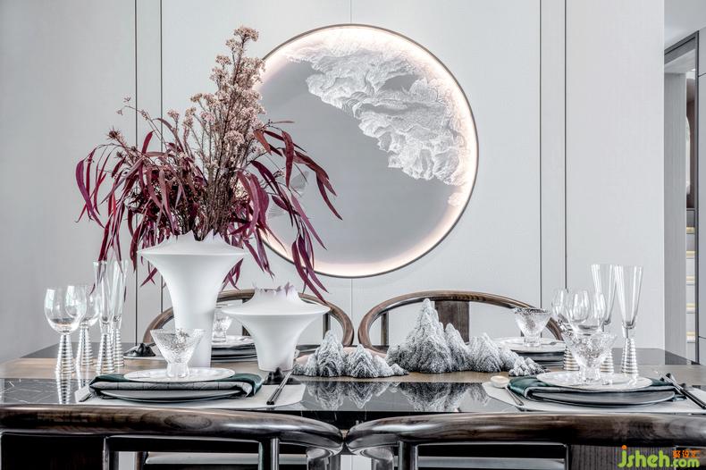 設計師將東方的“天人合一”化作設計的“關系美學”。入內,客廳軒敞明亮,別有寬境,優(yōu)雅簡練在延綿的景觀中隨性而行,返璞歸真。山形、磷光、飛鳥等元素運用細膩且豐盛,畫中有景,景中有致在靛青淺墨的空間中,樣板房設計光與元素交織遞進,組合成均衡和秩序感的原型。