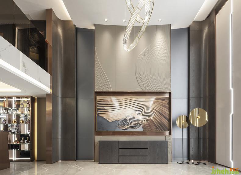 負(fù)一層設(shè)置家庭影院和吧臺(tái),影音室以舒適的皮絨座椅、全息投影技術(shù)提升整個(gè)空間體驗(yàn)感和互動(dòng)性。在這里,多種沉浸式的娛樂體驗(yàn),帶給居住者精神生活的極致享受。