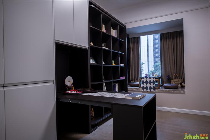 書房增加了空間的靈活度,可以自如收放的書桌與書柜讓空間靈活多變,在有客人來(lái)訪時(shí),可以變成客房。室內(nèi)設(shè)計(jì)師