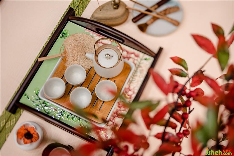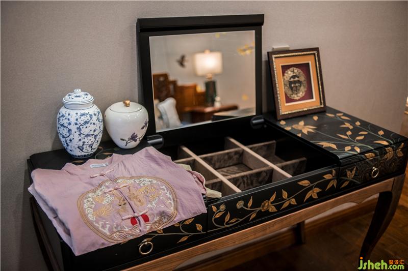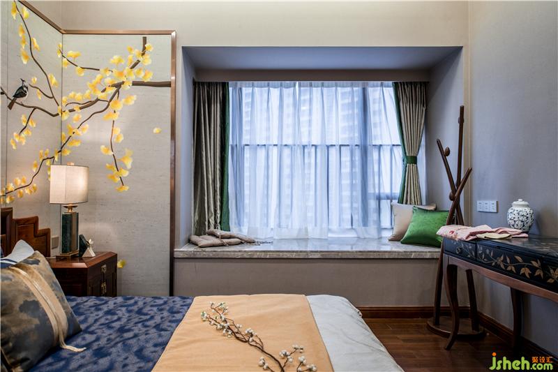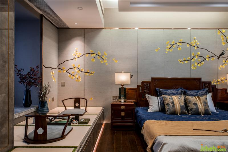 “疏影橫斜水清淺,暗香浮動月黃昏”。 主臥極具東方文化內涵的梅花與元素,圓月梅花,滿載祝福之意。中式屏風的背景墻搭配造型古樸的木床,營造采菊東籬的中式田園的閑淡意境。室內設計師