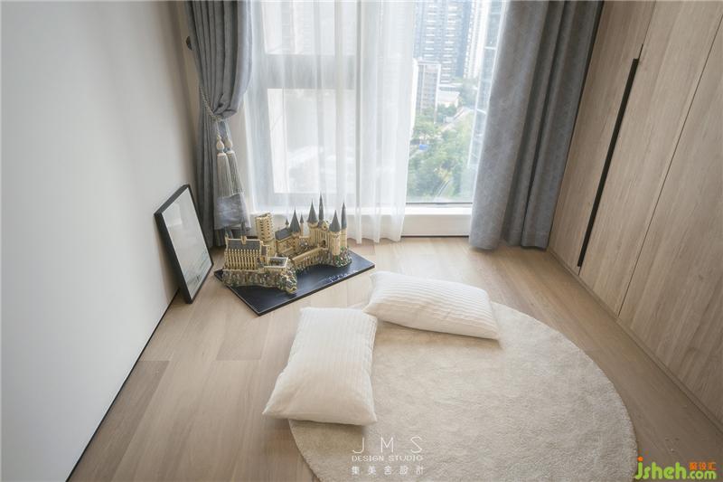 平時床收入墻體后,室內更顯得自由且空曠,搭配精致的暖色調城堡玩具,鋪上閑適的圓形地毯,會是一處不錯的兒童樂園。