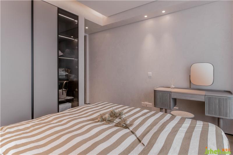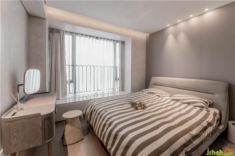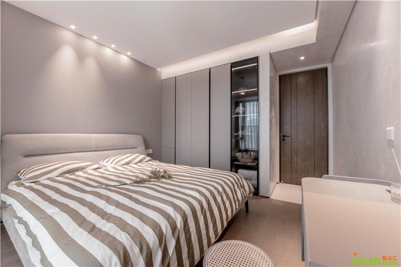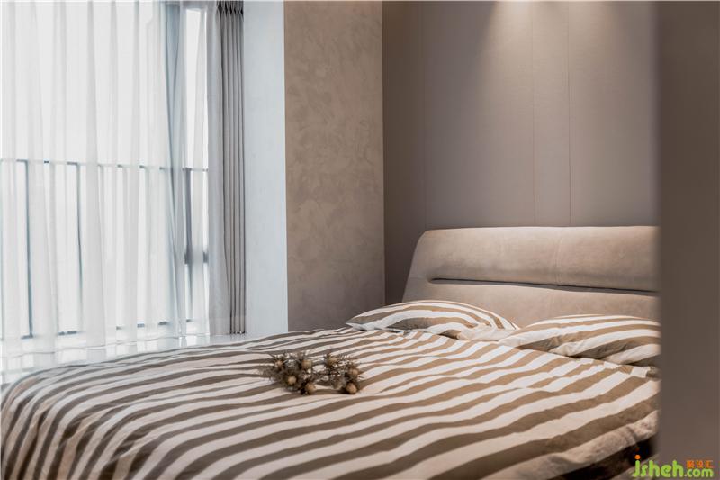 進入主臥室,天花及壁面維持統(tǒng)一的干凈質(zhì)感,通過灰棕色系烘托溫馨氛圍。