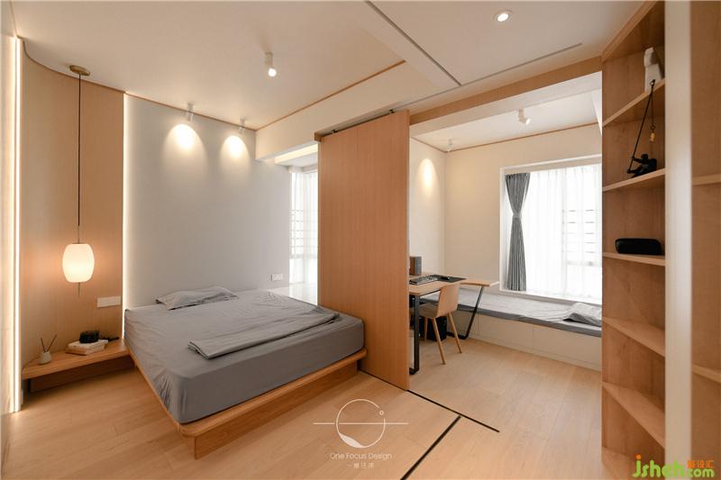 深圳室內(nèi)設(shè)計(jì)師將陽(yáng)臺(tái)和主臥兩種不同的生活場(chǎng)域妥善地安排在方正的格局里,統(tǒng)一的木質(zhì)色調(diào)和相似的家具高度降低了陽(yáng)臺(tái)和臥室的隔閡,增強(qiáng)了空間的互動(dòng)性。同時(shí)在榻榻米下安排了大量的收納空間,方便業(yè)主保持整體空間的整潔度。
