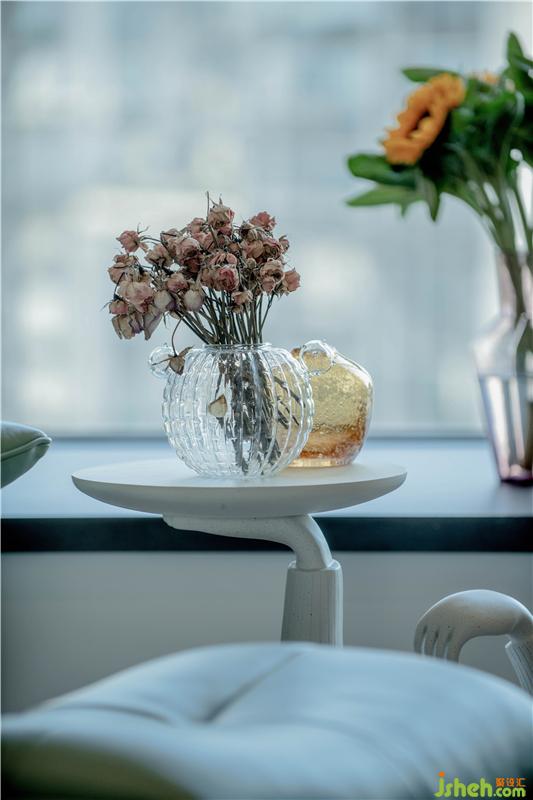 各色鮮艷擺件的碰撞,給人以強(qiáng)烈的視覺刺激,調(diào)動(dòng)了空間的活躍性,讓整體冷調(diào)的客廳變得鮮活溫馨起來,呈現(xiàn)出凌亂的美感。