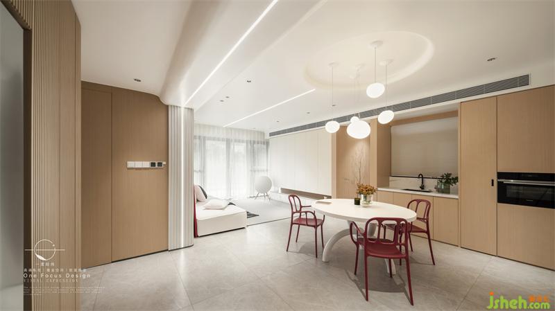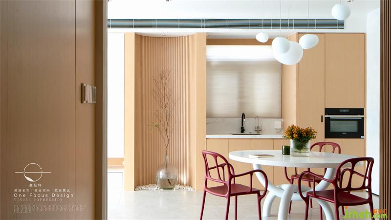 白色的餐桌、復(fù)古紅色的餐椅、橢圓造型的吊燈,簡單閑適,令人對每日三餐的美好盛筵新生向往。
