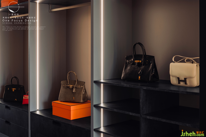 琳瑯滿目的包包與鞋物,那是多少女生夢幻的衣帽間!線性的燈光整齊規(guī)律,炫酷而夢幻的儲物空間,設(shè)計師不僅把控整體美學(xué)的視覺感官,也強調(diào)了家具到物品飾品等品質(zhì),為人的感官視覺體驗與居住舒適度打磨精細化細節(jié)。