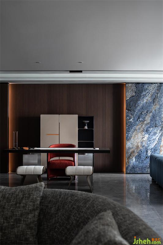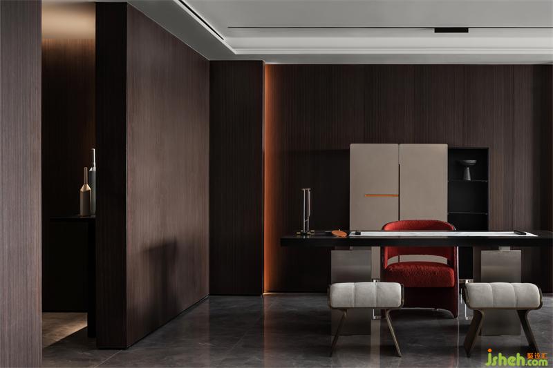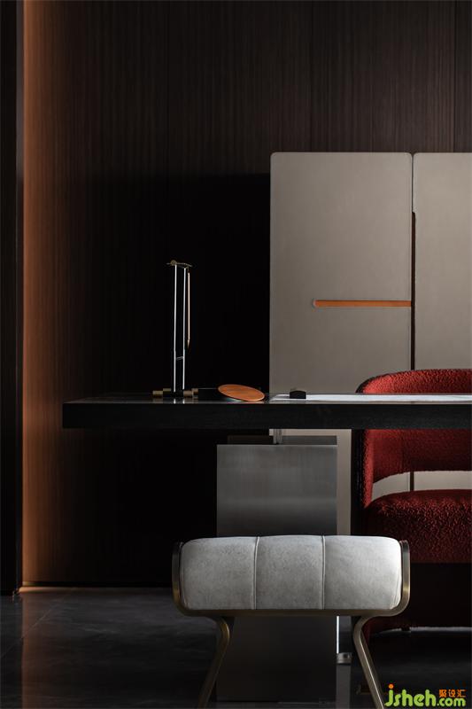 會(huì)客廳分為書法臺、會(huì)客區(qū)、品酒區(qū)和品茶區(qū)。書法臺采用黑棕灰紅四色搭配,木飾面的深沉、金屬的堅(jiān)毅和皮革布料的柔軟,形成了強(qiáng)烈的視覺感受。