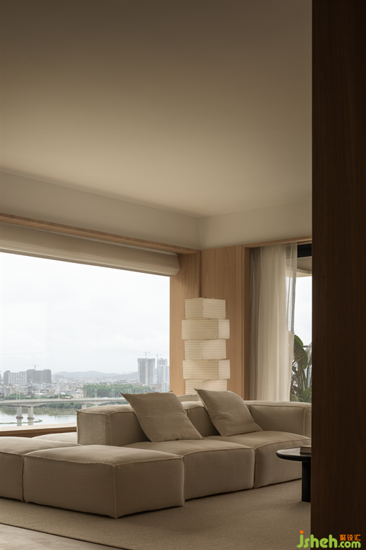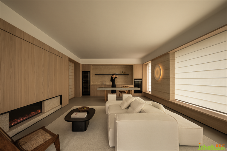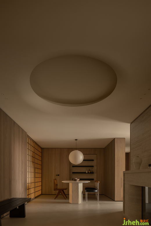 藏而通達,隱有乾坤。從玄關進入前廳,是一個聚合與流轉區(qū):私宅設計暗色木質條凳與淺色石紋壁爐形成與餐廳融合的第二玄關,新風與照明功能隱于天花圓頂之中,開合之間自由聯(lián)通廚房、客廳、臥室。動靜虛實,思深言淺,以至平和。