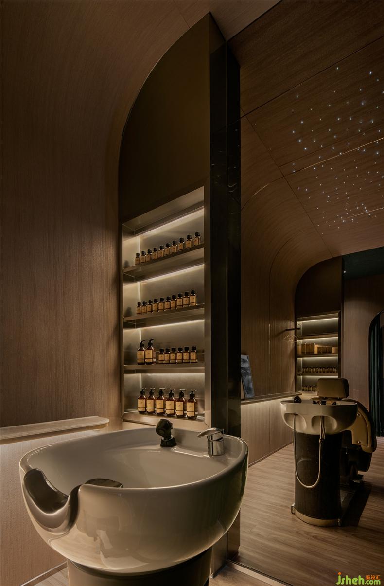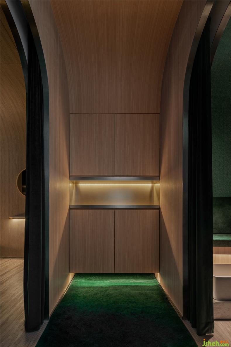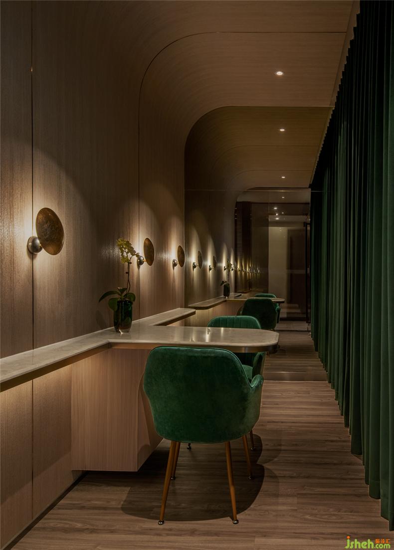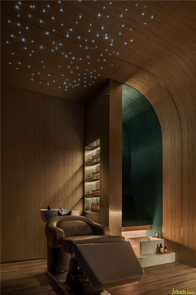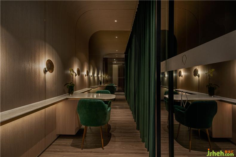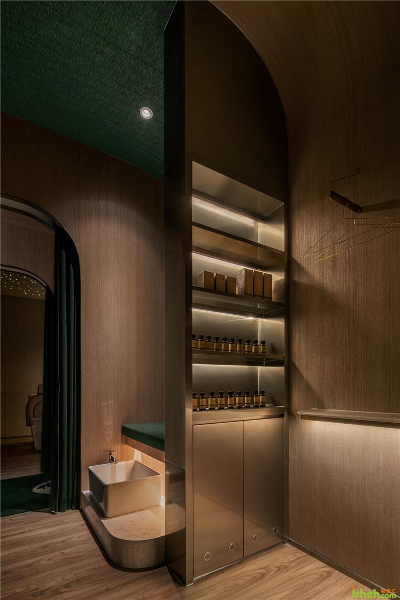 設(shè)計(jì)師堅(jiān)信愉快的消費(fèi)體驗(yàn)來自無微不至的細(xì)節(jié):咨詢室以列車餐車為設(shè)計(jì)靈感,如同兩三摯友暢談聊天,打破了零售空間中常見的買賣對(duì)立的關(guān)系,其中氛圍,好似列車經(jīng)過隧道,車廂亮著壁燈的溫暖場(chǎng)景;而展示產(chǎn)品的壁龕,也以列車中餐車的形式展現(xiàn)。進(jìn)入護(hù)理區(qū)域,浴足座位再現(xiàn)軟臥包廂的感覺,天花則處理成半弧形,當(dāng)客人護(hù)理時(shí),躺臥于沙發(fā)座椅上,室內(nèi)設(shè)計(jì)師視線接觸比較多的天花,所見是若明若暗的星空。