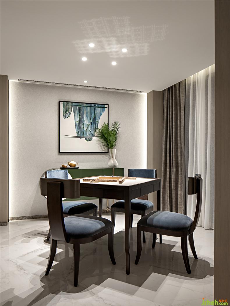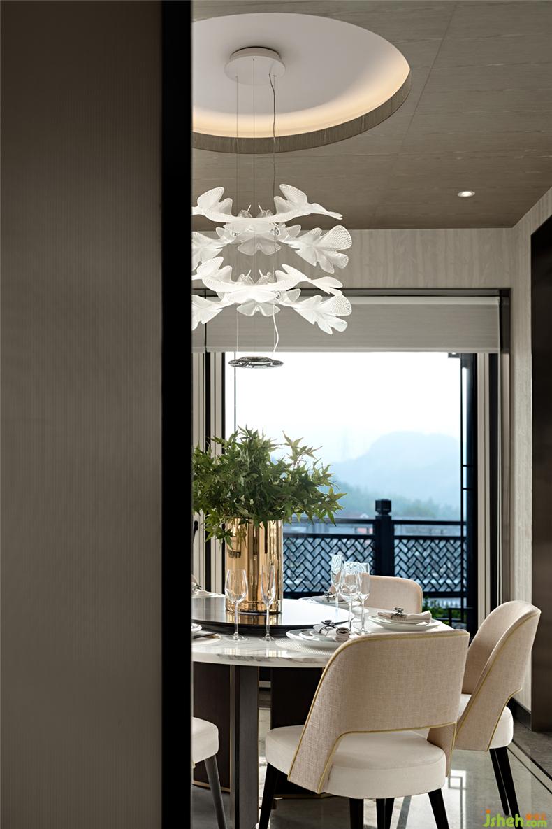客廳中青山藝術(shù)畫充分表達平靜自在的心境,“峽里誰知有人事,世中遙望空云山?!睆目蛷d的落地窗向遠處眺望,天空澄碧、纖云不染,遠山含黛、和風(fēng)送暖。畫與景融為一體、美輪美奐。