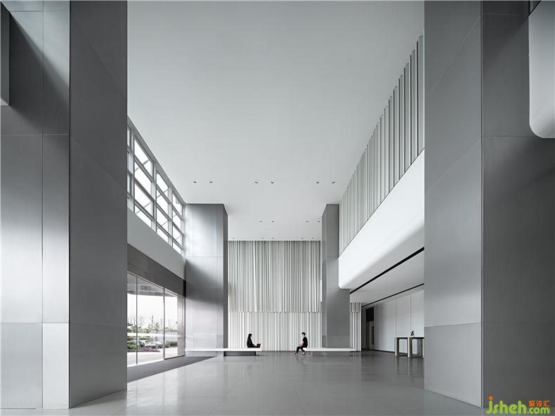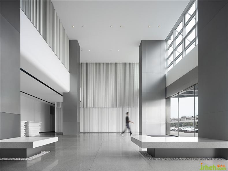 在空間布局上,WED中熙設計對原來上下兩層的大堂建筑空間的結構進行重新設計,對人流動線也重新規(guī)劃。原有空間中大堂中四根立柱孤立存在,連接橫梁阻礙視線破壞空間整體感,與外立面也毫無聯(lián)系,辦公室設計設計師重新調整了幾者的關系,把四根柱子鏈接做成整體的構筑物,也創(chuàng)造出人員行走和等待的不同動線。