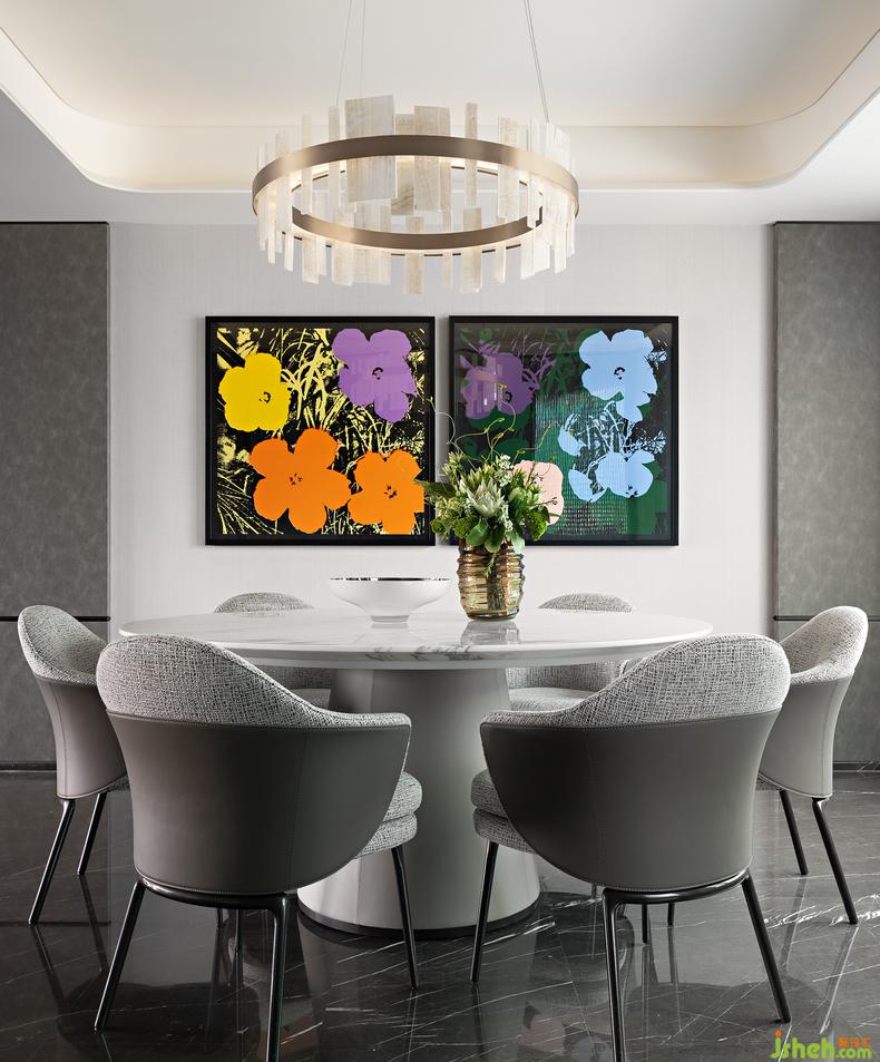 隨處可見藝術(shù)品的痕跡,拉開玻璃隔斷,映入眼簾的是餐廳里掛的波普教父Andy Warhol的經(jīng)典作品《Flowers》,Andy Warhol用波普藝術(shù)絲網(wǎng)印刷手法通過花系列描繪出一個(gè)時(shí)代,在時(shí)代流轉(zhuǎn)設(shè)計(jì)交融中給空間帶來永恒經(jīng)典的意味,帶來更多對美的體驗(yàn)和向往。