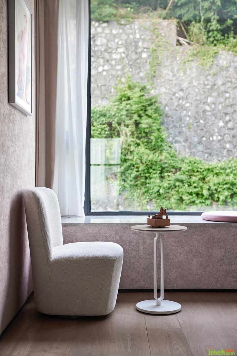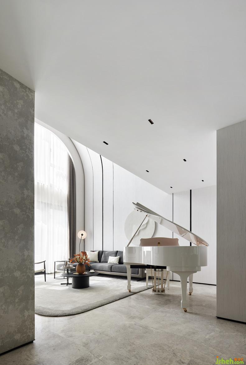 在整個(gè)客廳挑空的空間,隨著線條伸展的方向,空間力量乍現(xiàn),別墅設(shè)計(jì)空間感與節(jié)奏感不言而喻。從二層到一層傾瀉而下的整面落地玻璃將自然光引入,再經(jīng)過(guò)室內(nèi)中三角琴帶來(lái)的悠揚(yáng)奏鳴曲,氛圍被重構(gòu),讓藏在光影變化和相互作用中的歡快與跳躍感幻化出不同的畫境,同時(shí)增加了整個(gè)房子的藝術(shù)氣息。