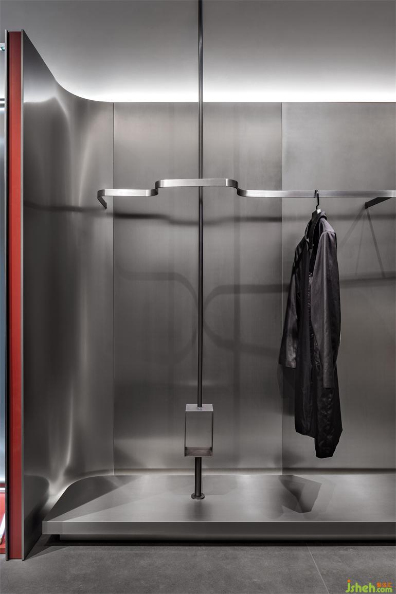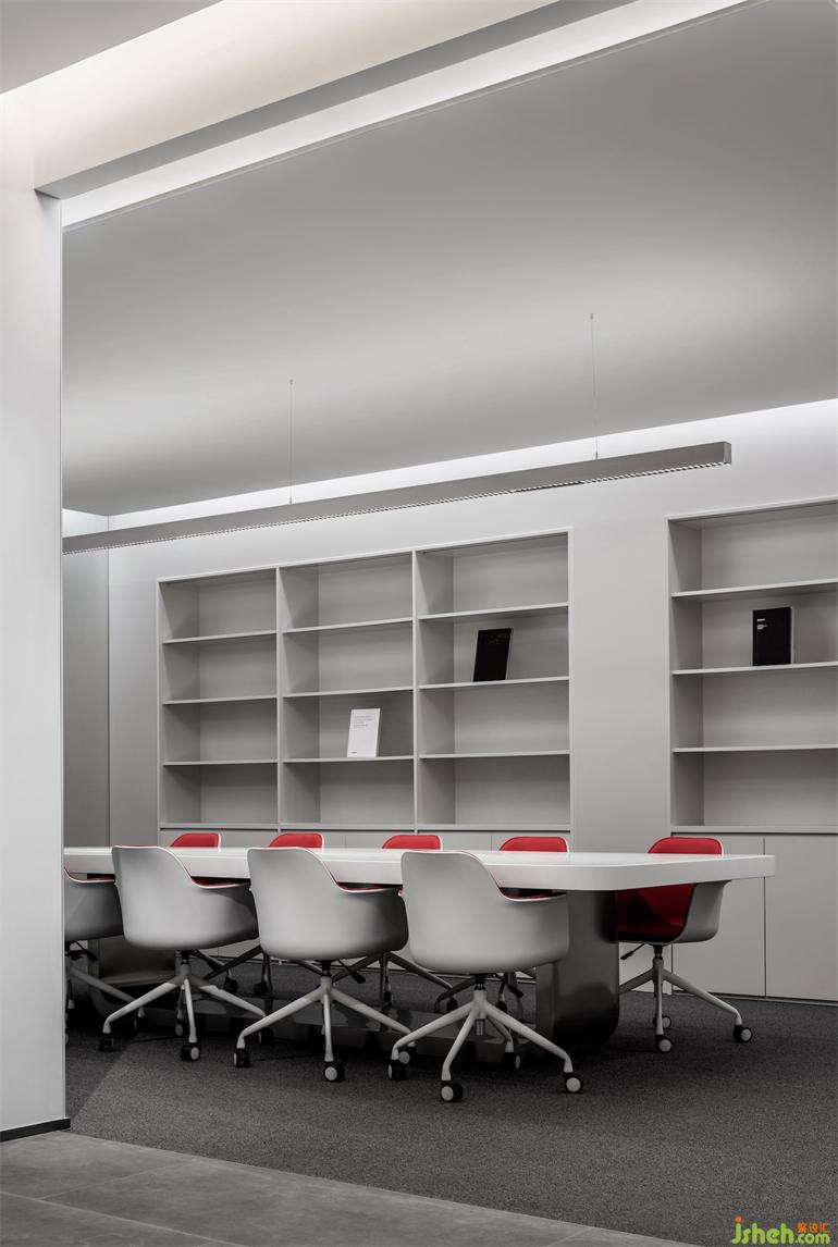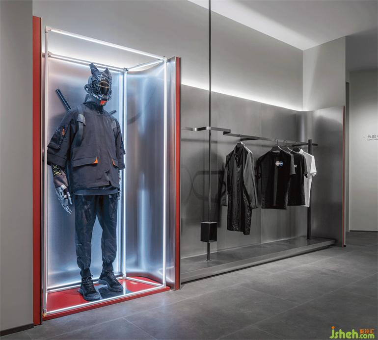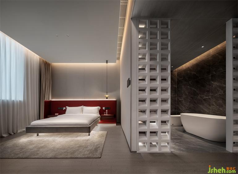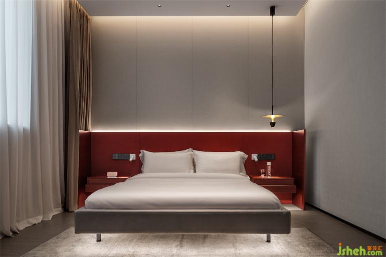 設(shè)計(jì)師強(qiáng)調(diào)智能照明賦予精品酒店場(chǎng)景的便捷及舒適性,在天花造型、專(zhuān)賣(mài)店設(shè)計(jì)床沿底部、床頭桌底部、洗手臺(tái)底部、衣柜隔層等各局部細(xì)節(jié)中增添間接照明,映襯產(chǎn)品的精良工藝。借由藝術(shù)與功能的平衡,床頭垂墜的藝術(shù)吊燈,在正紅色床頭板的映襯下,更顯意境氤氳。