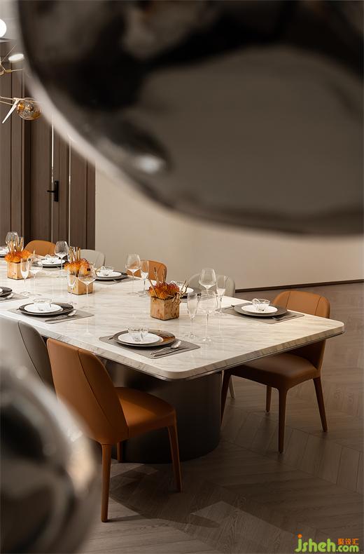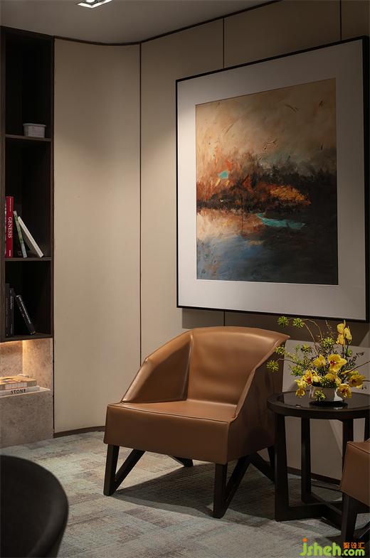 生活是藝術生長的養(yǎng)料,而空間是生活方式的場景化。繞至宴會廳后側,九廬NOVE CLUB會所設計在造型與設色的形式表達上,設計師有意通過一定的留白與燈光烘托下的明暗關系,營造舒適閑雅的人文體驗。時光流轉間,從容自如的狀態(tài)貫融整個空間,最終落點于圈層認同下的場域共鳴感。