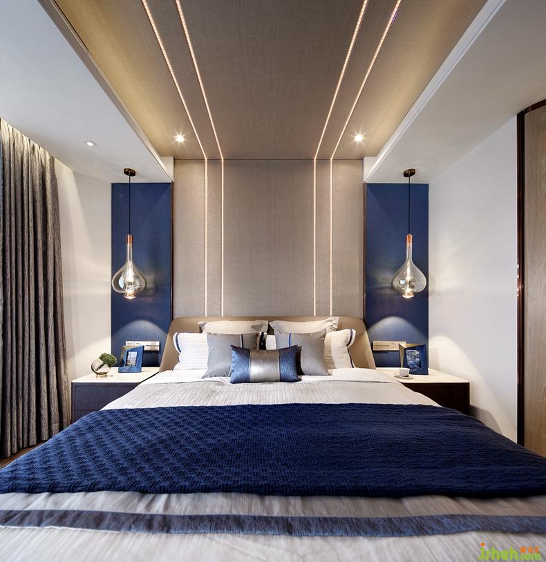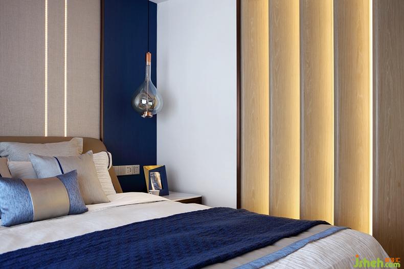 臥室以藍(lán)色為空間主色調(diào),如同海洋般的寧?kù)o深邃,塊面與線條的組合穿插,塑造出整體協(xié)調(diào)感及韻律感,也模糊了室內(nèi)與室外的界限。室內(nèi)設(shè)計(jì)師大面積的落地玻璃增加了空間的通透感,室內(nèi)也收獲了更多的陽(yáng)光照射,結(jié)合細(xì)致豐富的燈光場(chǎng)景,展現(xiàn)出極具現(xiàn)代感的美學(xué)空間。