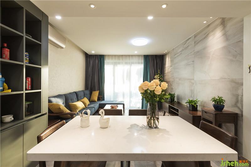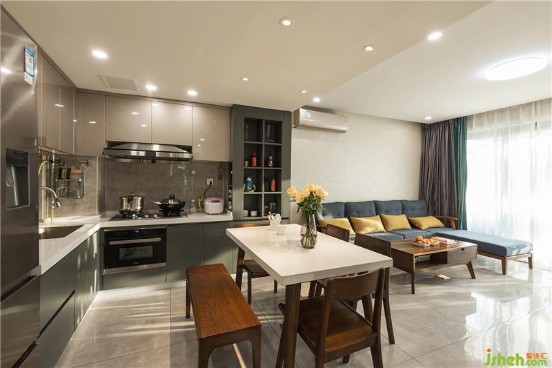 客餐廳整體空間線條干凈、利落,簡約的實木家具帶來溫潤感,創(chuàng)造出空間輕松、舒適的氛圍,以藍(lán)色系坐墊和明黃裝飾物點(diǎn)綴,令原本的淺棕墻與簡單的木質(zhì)家具擁有了靈動的氣質(zhì)。地面簡潔處理,天面墻面地面色彩層次分明而協(xié)調(diào)。櫥柜臺面和儲柜臺面同一材質(zhì),簡潔協(xié)調(diào)。酒柜和櫥柜一體設(shè)計,這是小空間有溫度的創(chuàng)意,增加了功能和美感。酒柜邊緣設(shè)置了一定寬度的邊框,這樣顯得更有層次。側(cè)面邊框設(shè)置小隔層,剛好可以放調(diào)味。這些細(xì)節(jié)都增加了使用價值和同時也增加了美感。室內(nèi)設(shè)計師