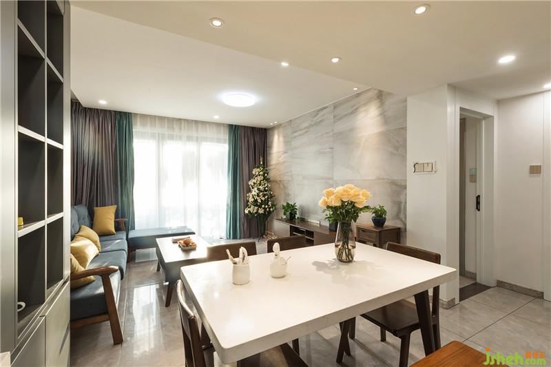 用材:櫥柜--歐派,地磚--歐神諾,電視背景墻磚--寶路莎, 電器--方太,涂料--威羅,潔具--科勒,鋁合金--壹號門窗