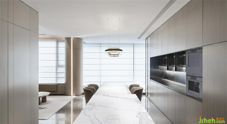 烹飪是一種快樂,在追求廚房社交屬性的當(dāng)代,設(shè)計師將客餐廳不同部分的聯(lián)系建立在流線帶來的自由度上,并讓區(qū)域之間有著互通邏輯的流線。
