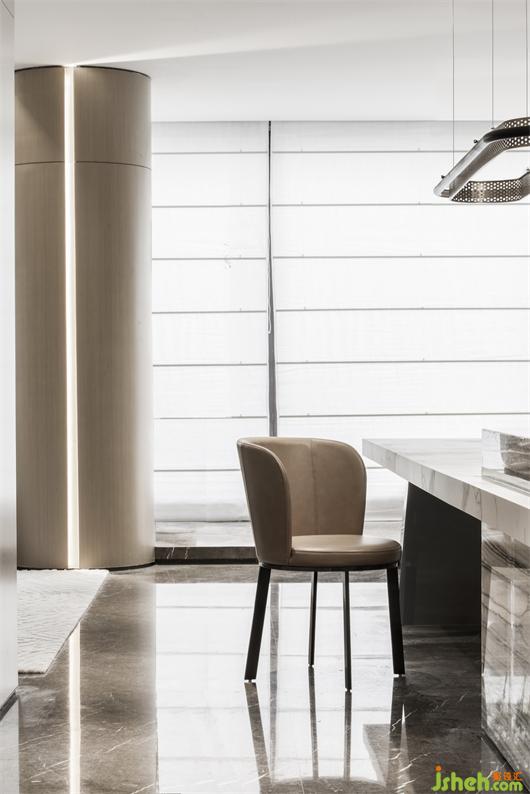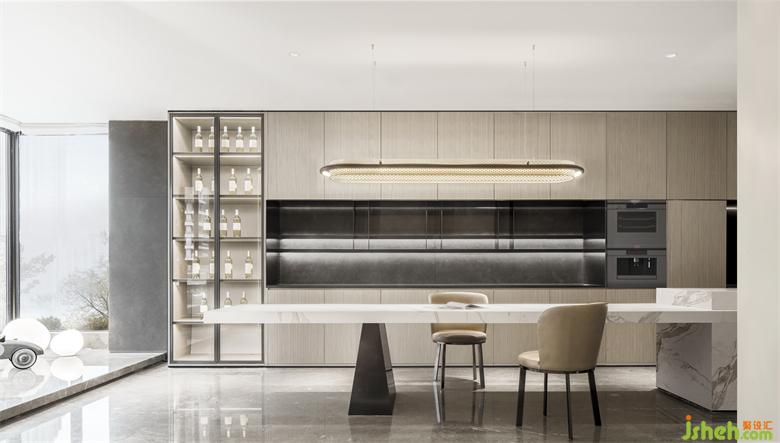 疊墅樣板房設(shè)計師在別墅一層的設(shè)計中,打破了傳統(tǒng)的客餐廳的布局,讓開放式廚房成為了視覺的中心和所以動線的連結(jié)。6200mm的一體化超長餐桌島臺,強調(diào)簡約美學(xué)與功能的平衡,提升烹飪的效率及美感,它當(dāng)然可以輕松滿足家庭的餐廚需求。而通過島臺這個寬敞的社交與自由流通的空間,將其變?yōu)橐粋€吸引所有家人成員活動的磁石,才是本案設(shè)計的真正主旨。