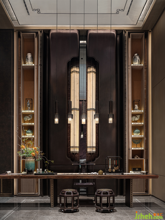 常言道,筆跡之處見風(fēng)骨。作為專注于新中式的代表性房企打造的TOP級(jí)項(xiàng)目,建發(fā)?天敔灣繼承了“儒門、道園、唐風(fēng)、華紋” 的精髓。派尚設(shè)計(jì)在本案中打破符號(hào)化的中式桎梏,別墅樣板房設(shè)計(jì)以宋代繪畫中內(nèi)斂、內(nèi)收的基調(diào)提純江陰山水的人文風(fēng)骨。心有丘壑、眼存山河,幽暗基調(diào)中青綠的隱現(xiàn),又描述著江陰山水的相依之感.
