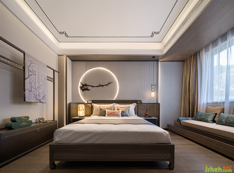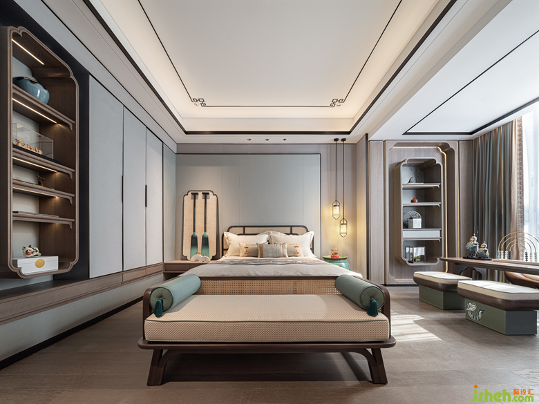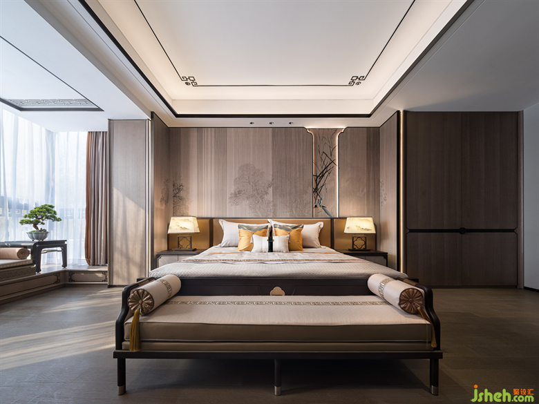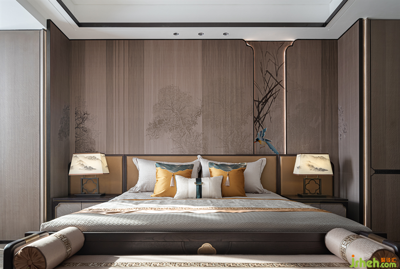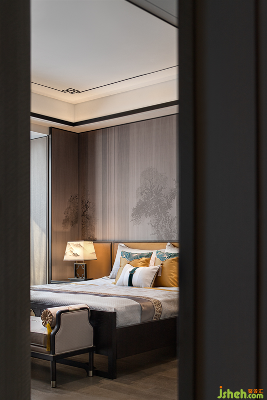 從電梯上至二樓,別墅樣板房設(shè)計(jì)映入眼簾的是三幅采用實(shí)木雕花工藝的中式元素掛畫,一步一景,穿過走廊,步入至次臥室空間,輕紗一般的陽光穿過碩大的落地窗灑入屋內(nèi)時。深灰色與艾綠、沙石黃的邂逅,磅礴壯美,疏密有度,遠(yuǎn)近濃淡如煙波浩淼兼水草豐茂的江湖,不落俗套。