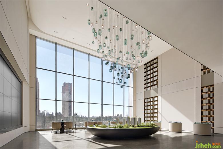 售樓處設計整面的玻璃墻,消弭了空間內(nèi)外距離感,光作為連接現(xiàn)實與虛幻的媒介,營造出藝術無限延展的維度,足以讓訪客翱翔其中。