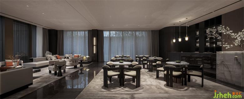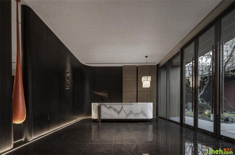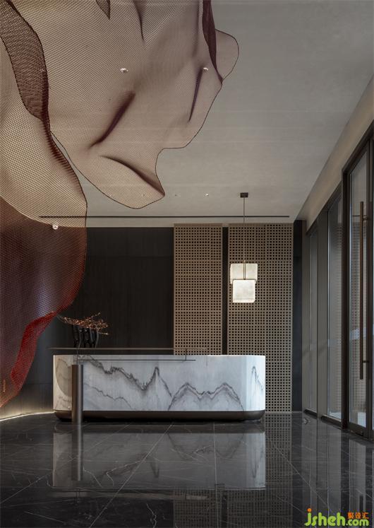 售樓處入口的接待大堂,是一個擁有沉靜安寧氣場的空間,而在這個深色調(diào)的空間中,一塊完整的山水紋大理石如同山水長卷般在空間中心徐徐展開,它和極簡的金屬線條構(gòu)成了接待臺的全部體量,這是一筆點睛的留白之筆,售樓處設(shè)計在燈光氛圍的烘托和聚焦之下,人流會像魚群一樣很自然地被吸引過去,如同走向故宮珍寶閣中展開的供人觀賞的千年畫卷。