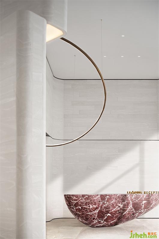 整個(gè)空間摒棄掉傳統(tǒng)的大型隆重的裝飾吊燈,用裝置藝術(shù)的手法去考慮室內(nèi)燈飾的布陳,大量簡(jiǎn)潔干練的弧形環(huán)形的藝術(shù)燈飾穿插其中,猶若星辰運(yùn)行的軌跡。