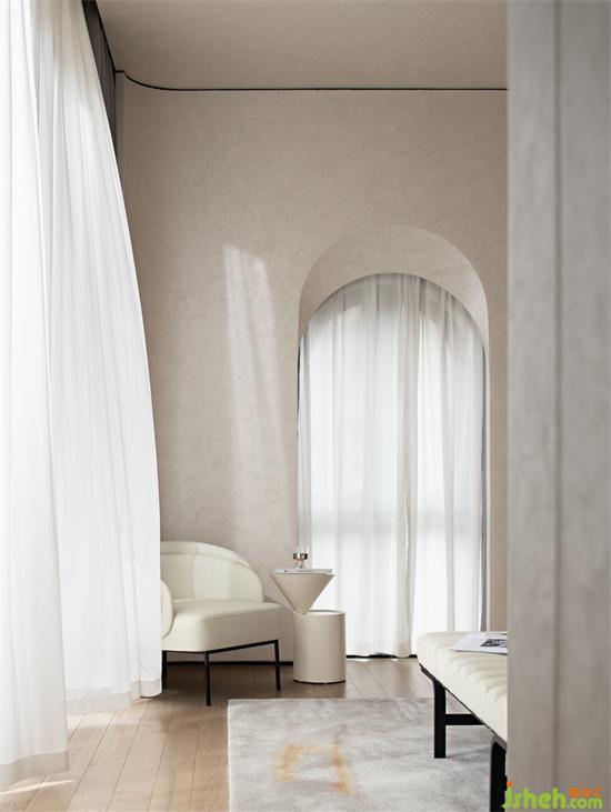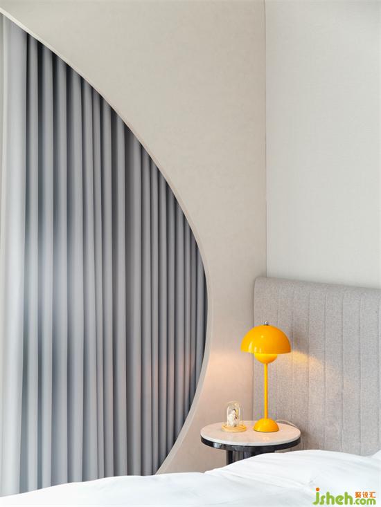 親子主題的客房空間也同樣通過立面的重塑規(guī)避了建筑開窗問題的痛點(diǎn),米色和灰色的日系配色,加上弧形鏤空的可愛立面造型,民宿設(shè)計(jì)讓整個空間充滿了童真和夢幻感。