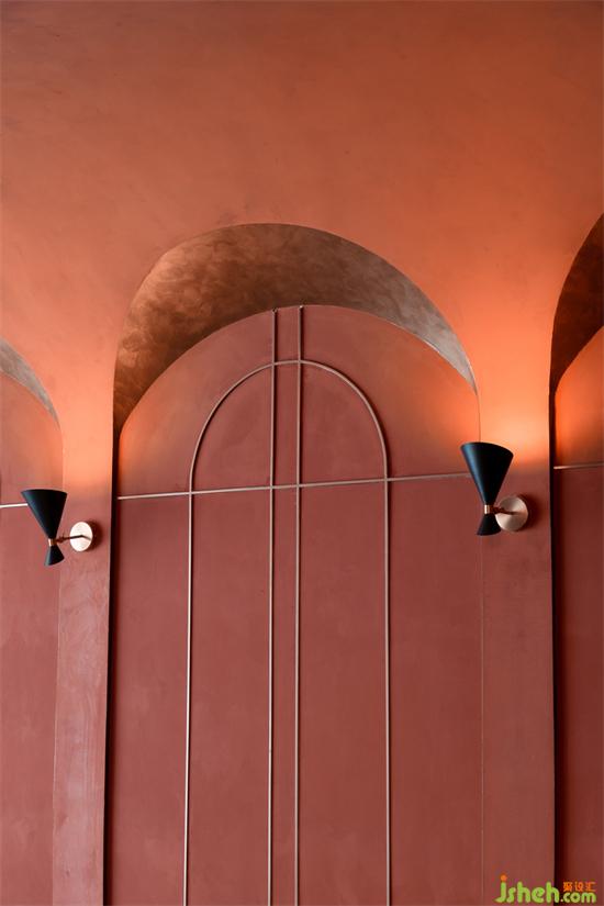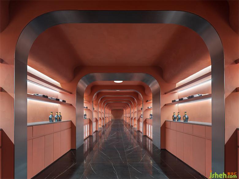 通往臨近建筑的酒窖通道也采用了同樣的配色,黑色大理石地面和金屬序民宿設(shè)計(jì)列的拱券結(jié)構(gòu),給這個(gè)悠長的地下空間添加了一絲特別的歐洲古堡般的神秘感。