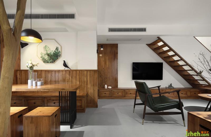 鞋帽柜以及電視柜的布置結(jié)合樓梯的第二踏,形成換鞋座面,讓老人和兒童變得輕松,下方整排抽屜放置零碎物品,避免了空間凌亂,整體自然和諧。