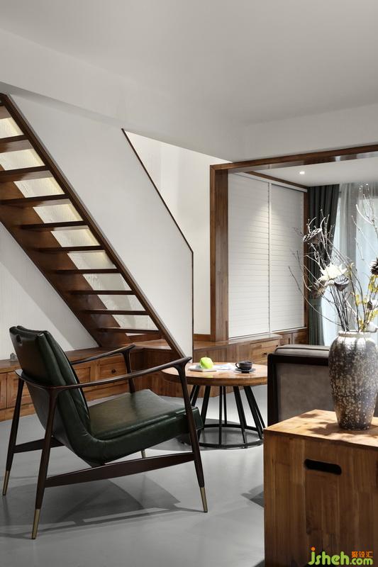 將原本在餐廳的樓梯移到客廳電視墻處,使得就餐空間輕松愜意。樓梯為現(xiàn)場制作,簡潔的扶手,顯得干練明快,和整體風(fēng)格融合。
