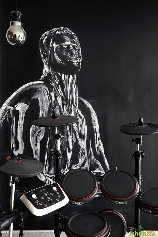 二層劃分出孩子學(xué)習(xí)架子鼓區(qū)域,此處黑板墻的運用和其他白色墻面形成強烈對比,設(shè)計師的手繪粉筆畫內(nèi)容采用搖滾基調(diào),和架子鼓區(qū)域結(jié)合默契。