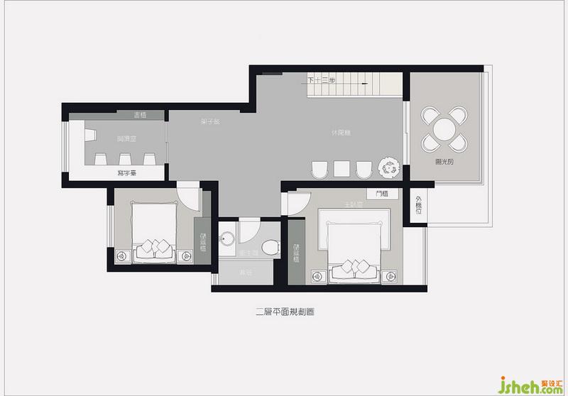 二層過廳定位為家庭的活動娛樂空間,大面積的空留,根據(jù)功能不同改變家具布置??捎冒讐ν队翱雌珊秃⒆觽兪止?、游戲,可與朋友喝茶打牌……
