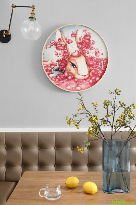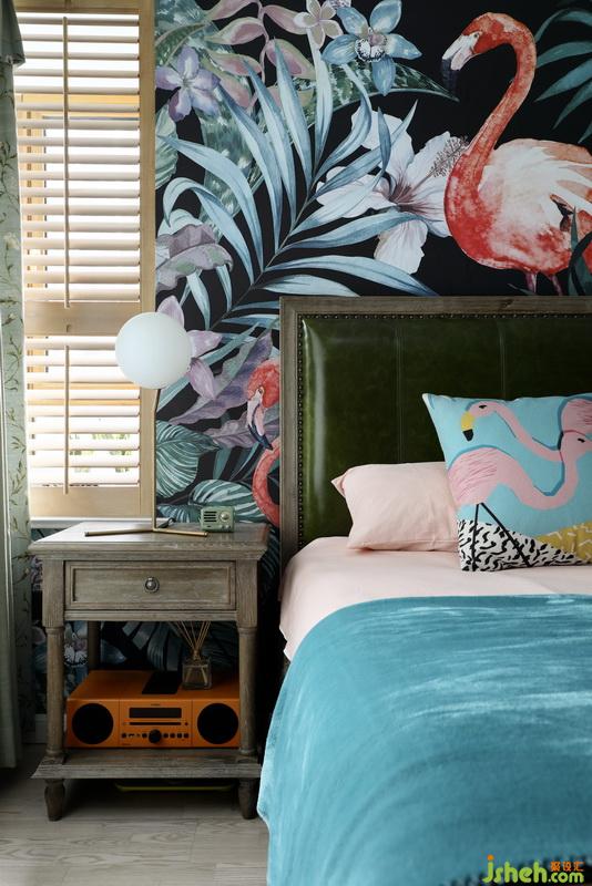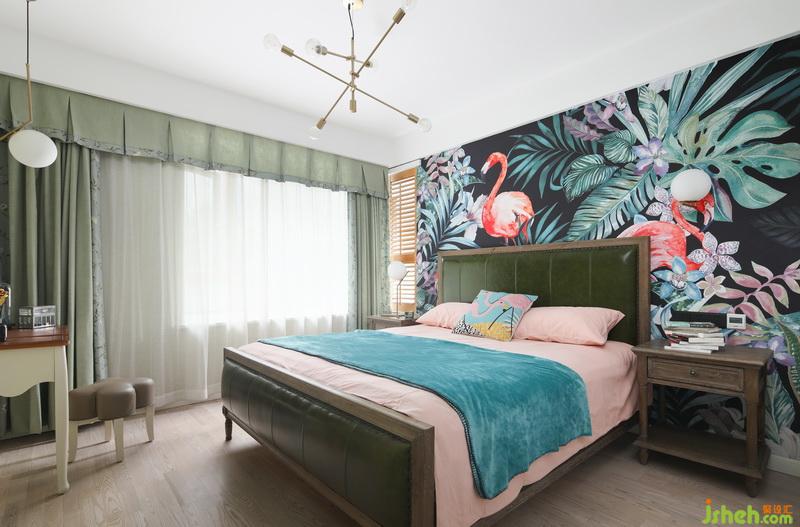主臥室床頭定制墻布,整體大膽活潑。作為私人空間,可適當(dāng)結(jié)合自己的喜好,個(gè)性化。